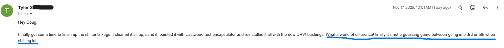 This set includes nearly every bushing in the shift linkage of a 1984-88' Justy. This set can make a huge difference in shifter feel and stops the guessing game when shifting gears.