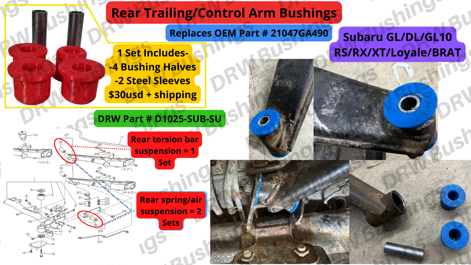 This set will fit most other Subaru cars of the same era as well, with one possible difference being the Front Sway/Anti-Roll Bar Mounts. If you have a non-BRAT/Brumby Subaru of this era, let me know and we can configure a set for your specific vehicle.