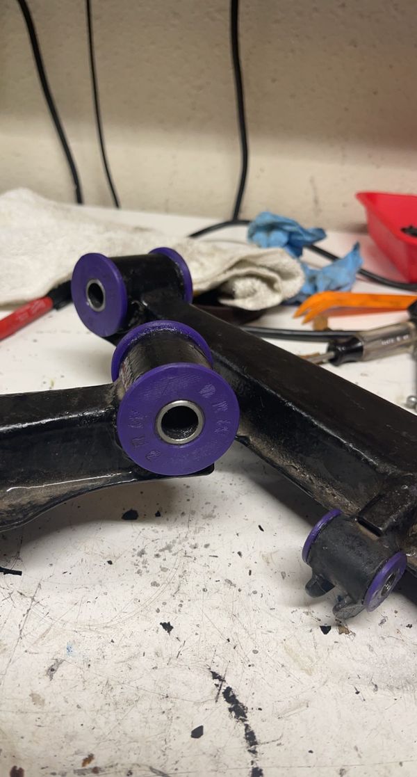 This is a set of bushings for the Front Lower Control Arms on a Subaru XT6. They are 36mm O.D. The original bushings outer metal shell will need removed from the bushing bore hole in the control arm, in order to install these new bushings.