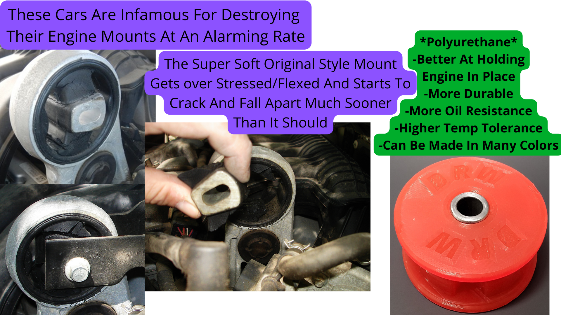 Now there is an upgraded Polyurethane Rubber option that will hold the engine in place much better, and have a much longer service life. These are not as hard as a normal "race" polyurethane mount that you may be familiar with. These are made of 70A Shore Hardness polyurethane which is softer than the 80-95A that most polyurethane mounts are made of. The 70A is a happy medium that is more firm than the original mount, but is not so hard that it transfers a lot of engine vibrations into the cabin of the car. Although there may be a slight increase in vibration at certain RPMs, it will be nothing compared to the engine slamming with a worn original style mount.