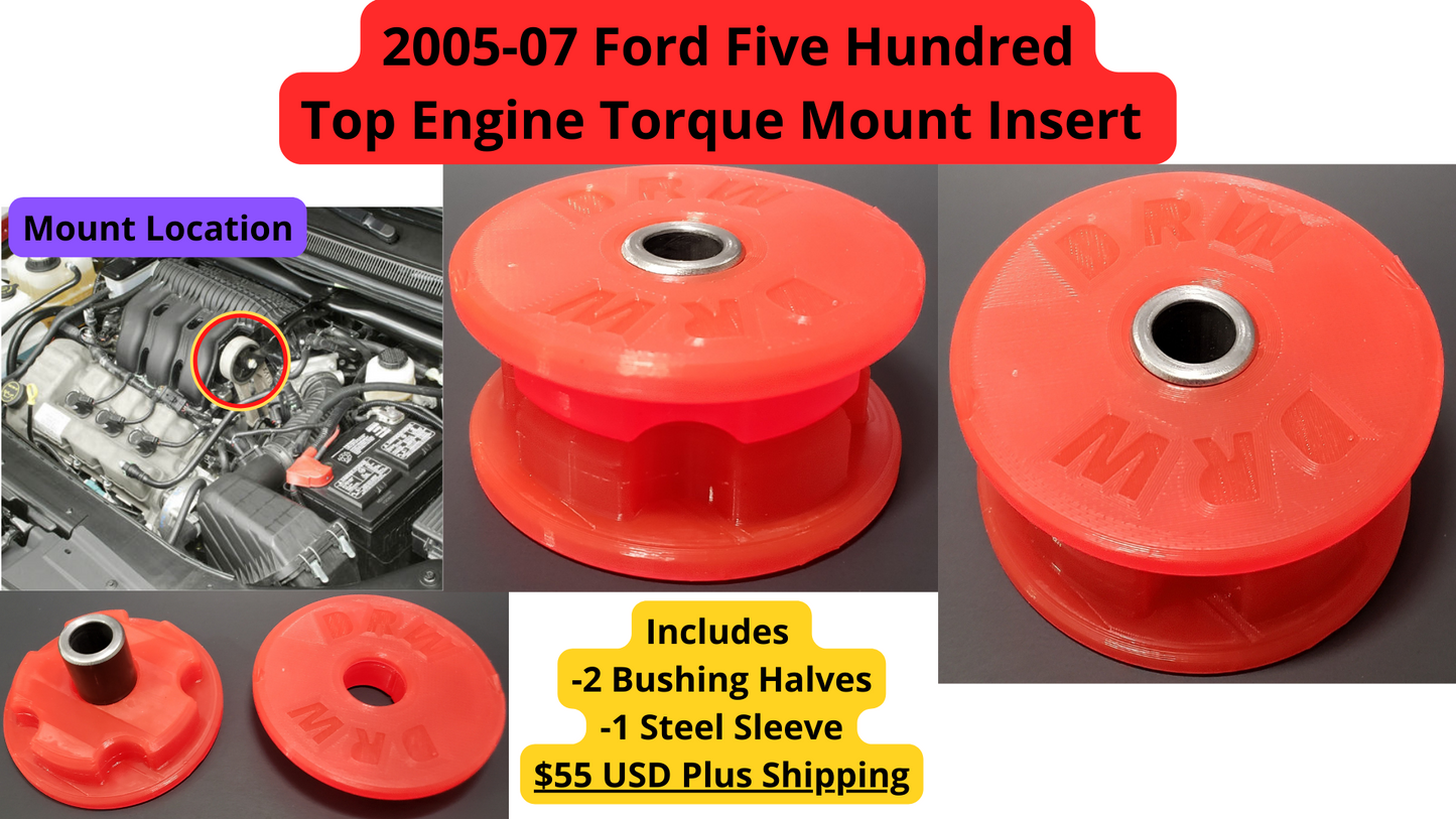 Polyurethane replacement top engine torque mount bushing insert for 2005-07 Ford Five Hundred/Freestyle and Mercury Montego.